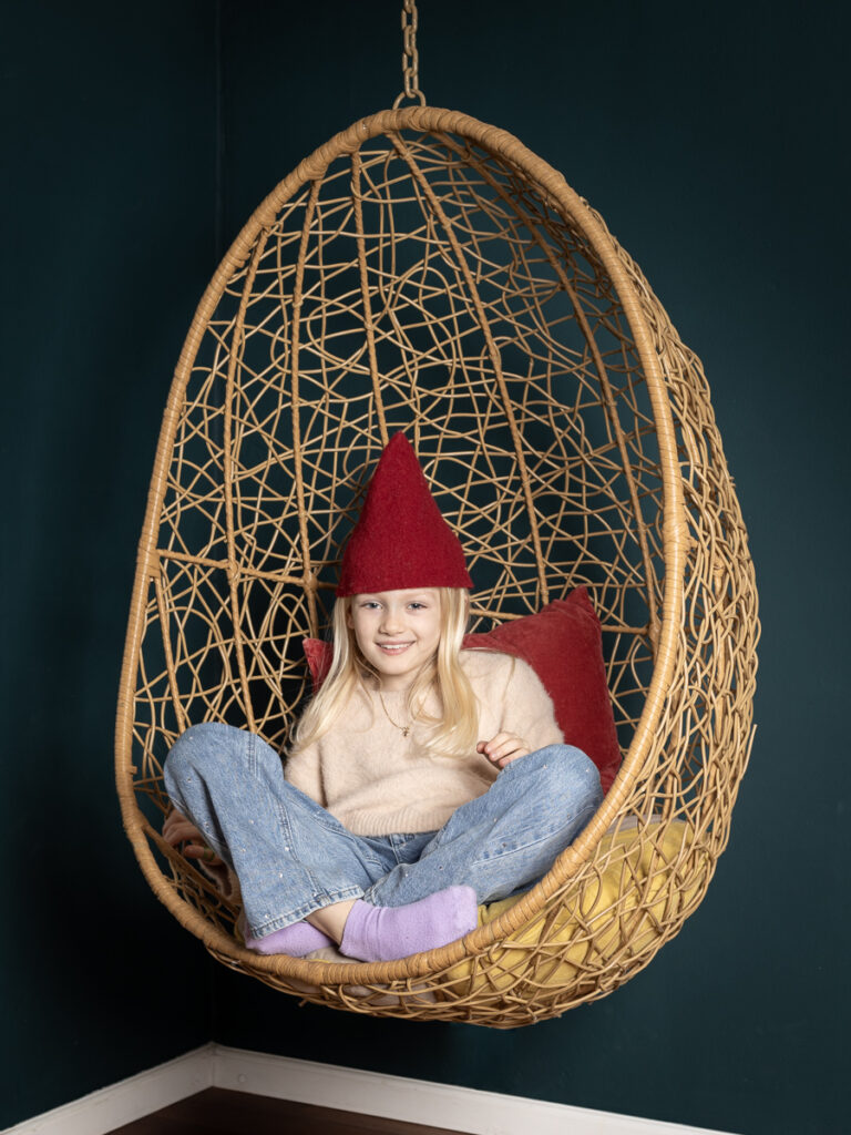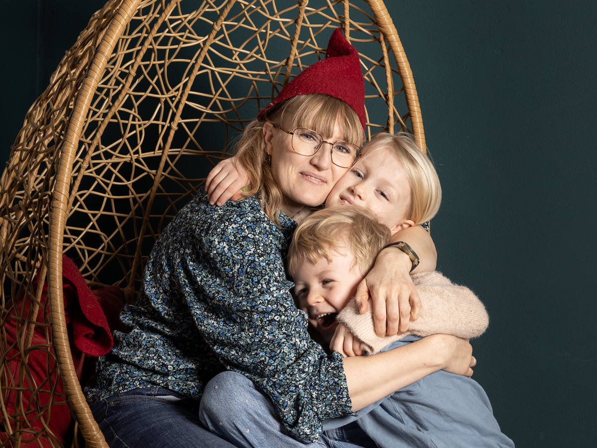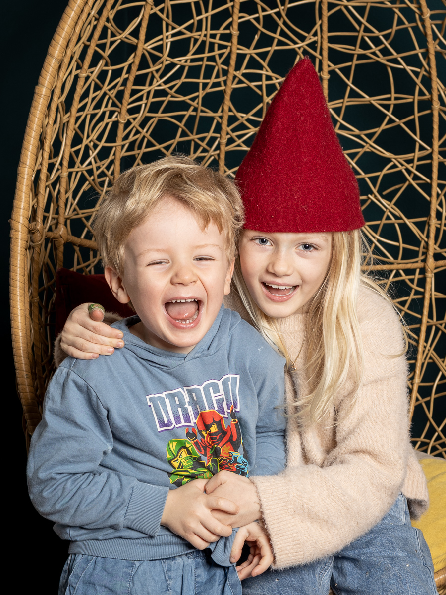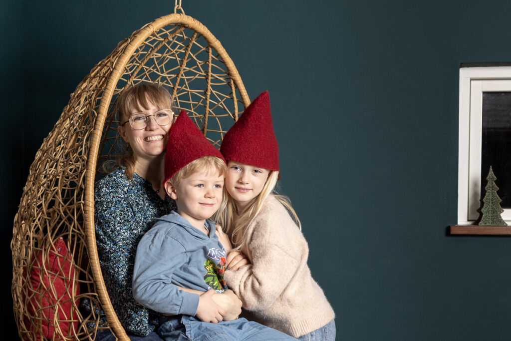 Den tid på året hvor denne skønne familie stod klar til årets juleportrætter. En glædelig julefotografering, med studieportrætter her hos Winther Sol Foto. Der var medbragt godt humør og nissehuer, og selvfølgelig var der også lige tid til et par billeder i den skønne kurvestol i stuen – nu med en smuk petroleumsblå væg som baggrund.
